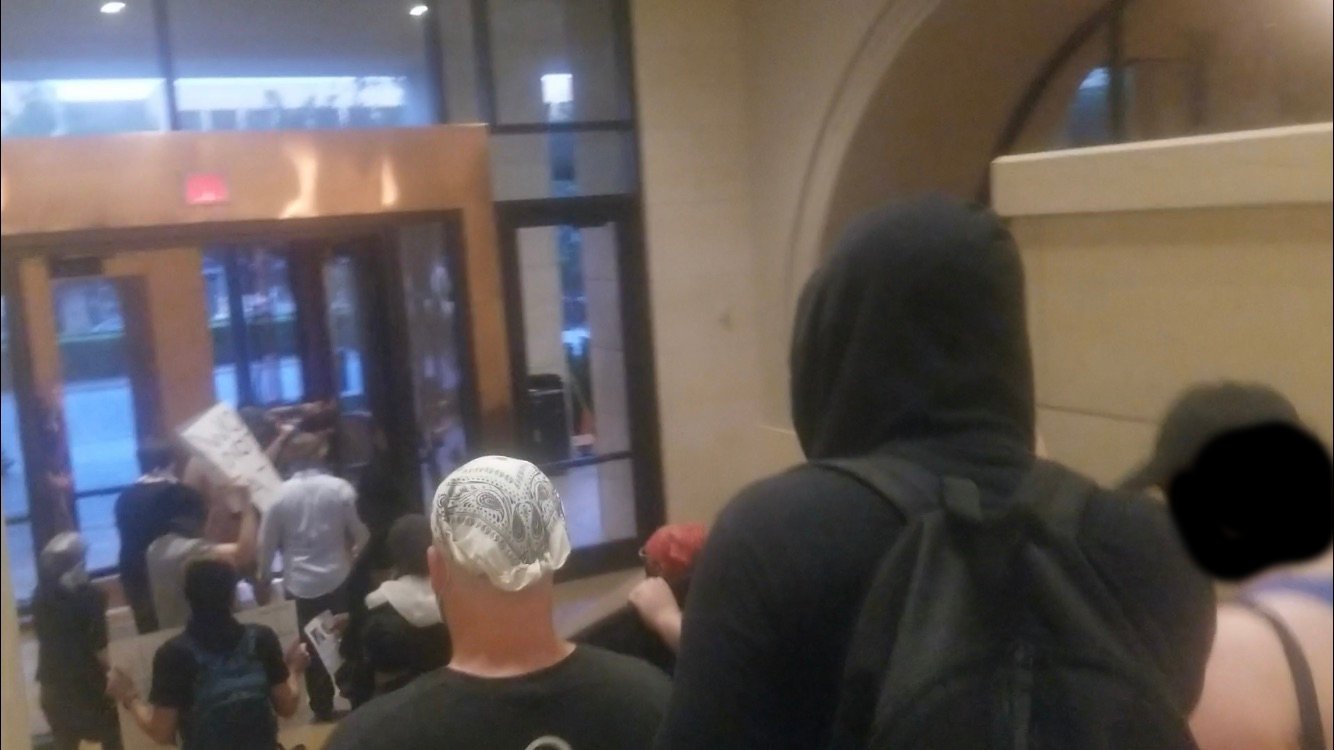 Antifascists enter the AT&T Conference Center lobby with flyers and clear demands