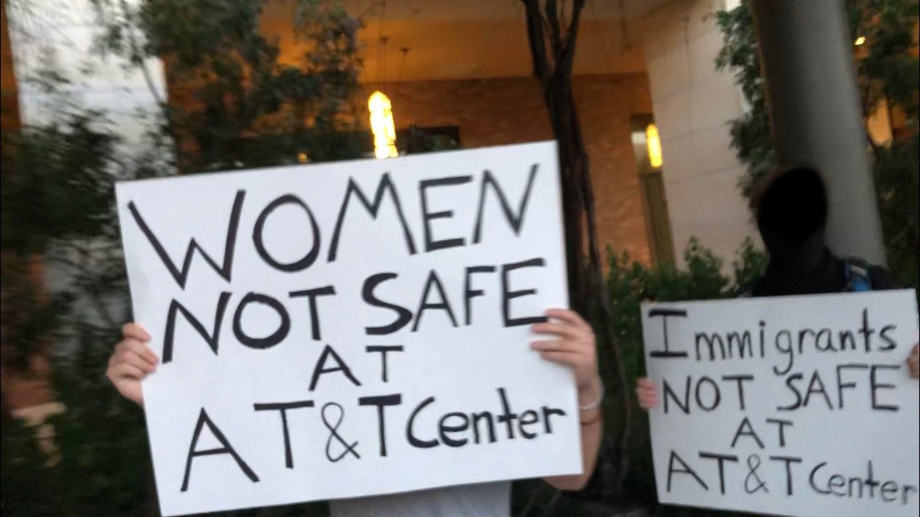 One AT&T Center employee made the perplexing decision to follow the crowd as it marched offsite. A few demonstrators made clear he should keep his distance, especially from non-male marchers. He quietly removed himself amid renewed chanting.